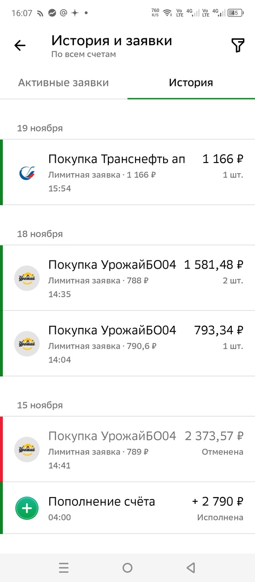 Купил лот Транснефти. За 1166 руб. Полистав историю заявок нашёл запись от 18 июля. Попытка купить Транснефть по 1275 рублей за лот. Котировки на неё снизились после дивидендной отсечки. И хотя следующая выплата будет через год я всё таки собрался купить их тогда. Не сошлись чутка в цене)). К моим хотелкам она снижаться больше не захотела и я потратился на что-то другое. И вот спустя 4 месяца лот Транснефти оказался в моём портфеле да к тому же на 8,5% дешевле. Да я прочитал новости о том что вдвое увеличивается налог на прибыль. Что приведёт к снижению дивидендов. Народ дружно принялся сливать, а я вот решил купить. Насколько правильно поступил покажет время. Сегодня вечером пришли купоны от Мотор и Антерра. Облигации МоторТ1Р04 у меня 10 штук с ценой 1001,5 руб и просадкой 23%. Перевёл купонные деньги на ИИС и взял ещё одну бумагу Мотор. Сейчас они пишут доходность 30%. Когда их покупал я то она была всего лишь 18%. Вывод: не надо было брать тогда , лучше было бы подождать и купить с