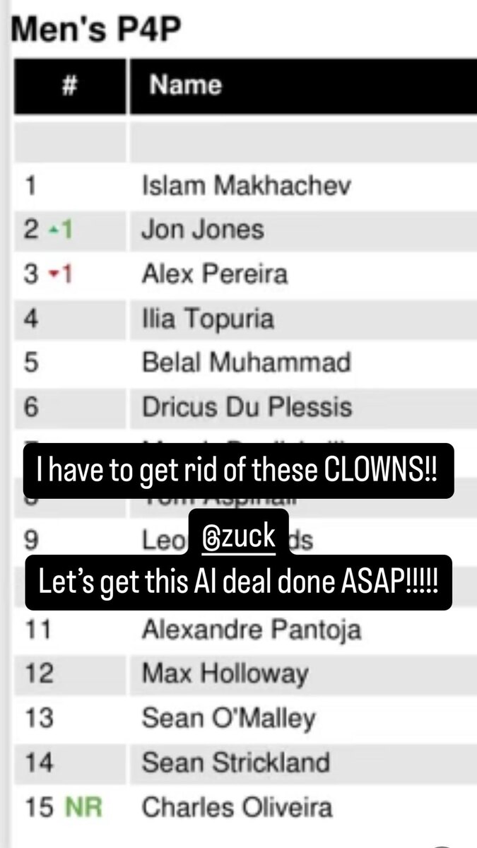 Глава UFC Дэйна Уайт в своем Instagram (принадлежит Meta, компания признана экстремистской и запрещена в России) раскритиковал новый рейтинг лучших бойцов промоушена вне зависимости от весовой категории. «Я должен избавиться от этих клоунов. Марк Цукерберг, давай заключим сделку по поводу искусственного интеллекта как можно скорее», — написал Уайт. Ранее в октябре Уайт говорил, что он открыт для того, чтобы рейтинги UFC составлялись частично с помощью искусственного интеллекта, и проконсультировался по этому поводу с главой Meta Марком Цукербергом, который является поклонником UFC. В свежем рейтинге лучших бойцов UFC вне зависимости от весовой категории (P4P) Джон Джонс поднялся только на второе место. Американский боец 17 ноября нокаутировал Стипе Миочича и защитил титул UFC в тяжелом весе. Уайт неоднократно называл Джонса лучшим бойцом в истории UFC, а в последнее время возмущался, что тот не находится на первом месте в рейтинге P4P, которое сейчас занимает чемпион в легком весе, рос