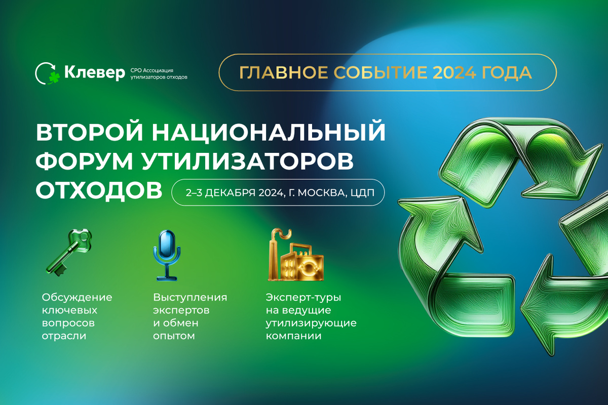 2-3 декабря 2024 года Ассоциация «Клевер» проведет в Москве Второй национальный форум утилизаторов отходов. Это событие станет первым в России профильным мероприятием такого масштаба и соберет более 500 участников. Форум объединит собственников и топ-менеджеров утилизационных предприятий, представителей власти, СМИ, отходообразователей, производителей и поставщиков утилизационного оборудования и услуг.