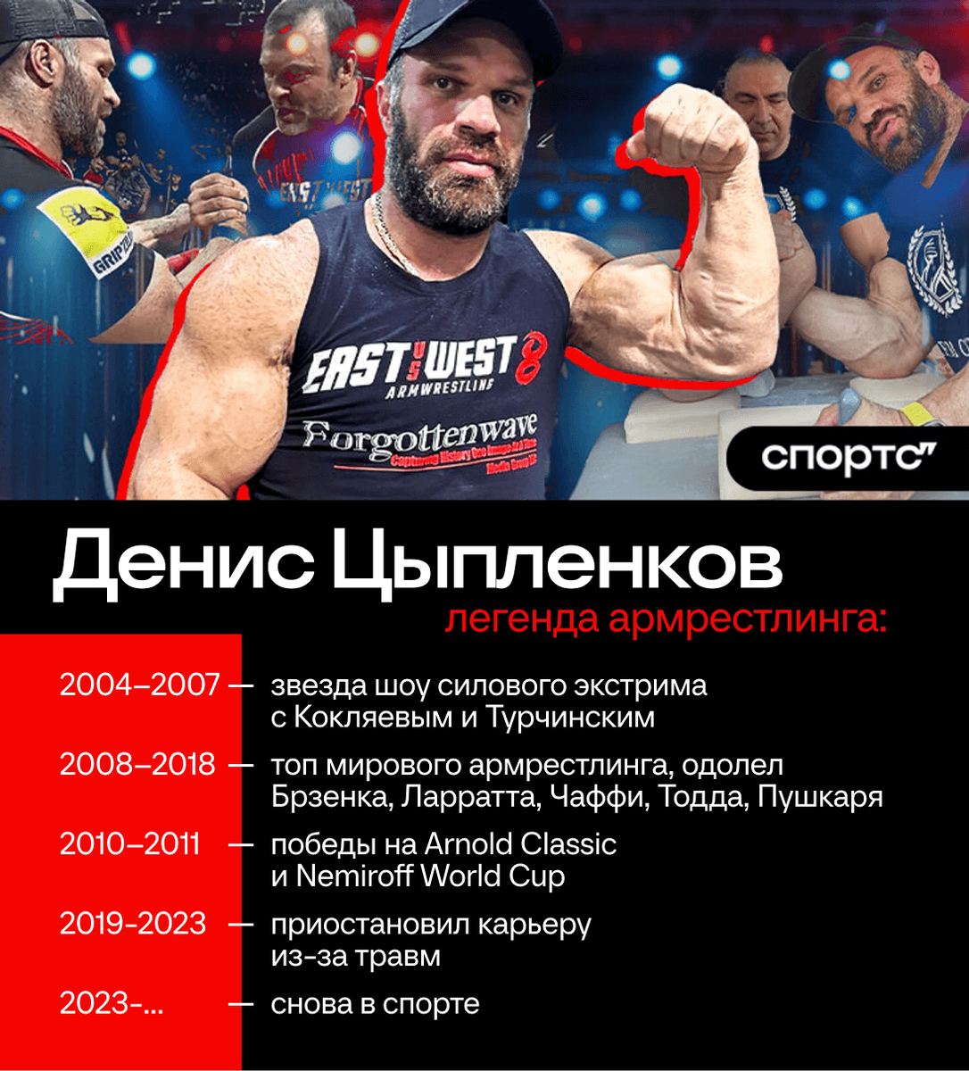 42-летний Денис Цыпленков – икона мирового армрестлинга, куда пришел из силового экстрима.