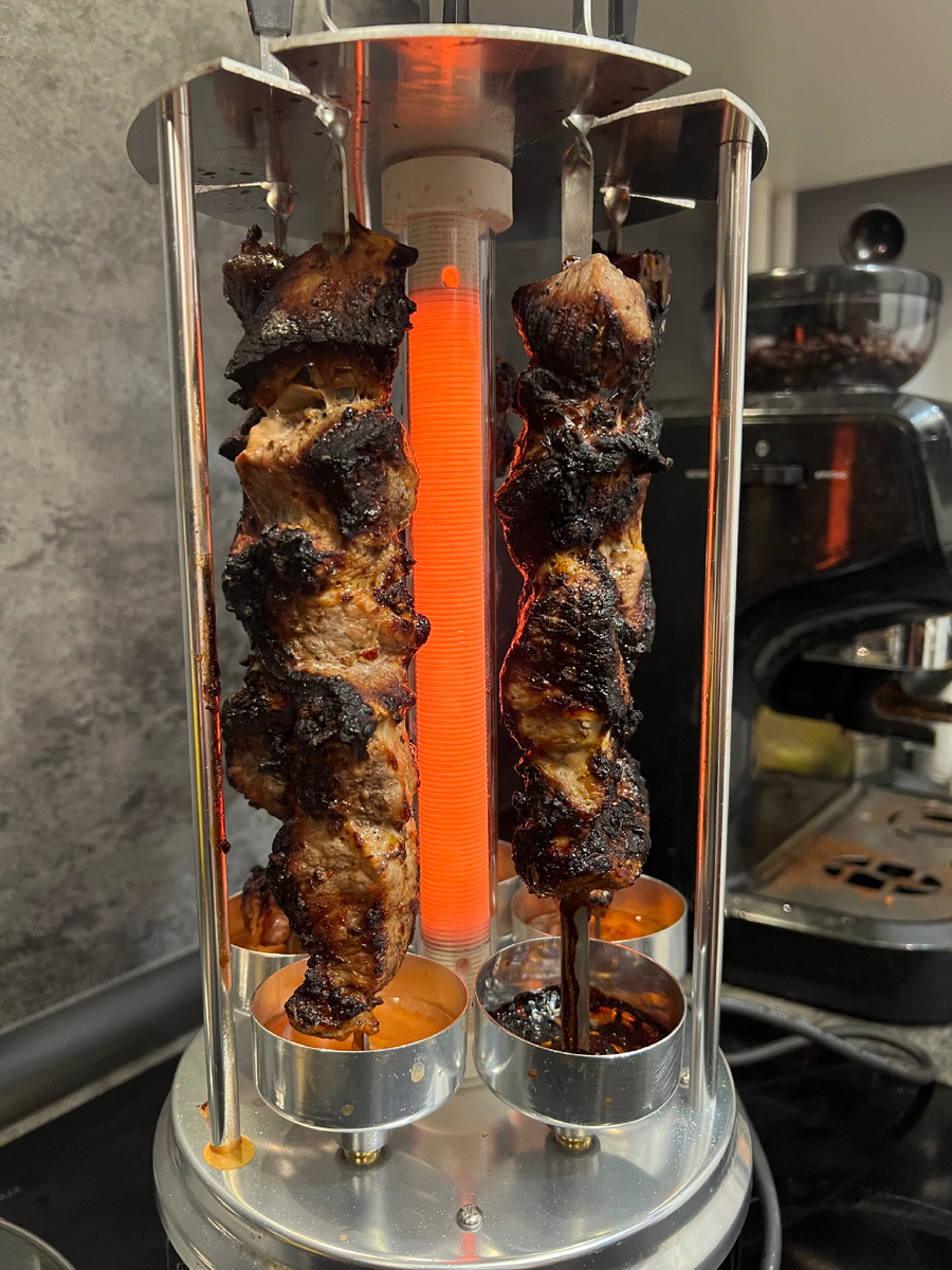 В нашей семье появилось новое чудо-техники - электрошашлычница! Я думаю у многих хозяек и хозяев достаточно много помощников на кухне, также и у нас уже есть мультиварка, аэрогриль, электрогриль, су-вид (кстати, новый и ни разу пока не использовался за 3 года 😅), возможно есть и еще что-то, но сегодня речь не об этом. Купили шашлычницу случайно, потому что закрывался деревенский магазин со всякими разносортными товарами и были большие скидки, а нам на глаза как раз попался этот приборчик. Естественно захотелось его потестировать. Сразу по приезду домой было решено приготовить шашлык прям в квартире. Прибор максимально прост в использовании, на шпажки, которые входят в комплект, надеваются кусочки мяса, подключаем шашлычницу к сети и переключаем кнопку в положение on. Мясо крутится, шашлык мутится 😅 Можно особо не контролировать приготовление, но жарится мясо довольно быстро. В первый раз мы немного проглядели и мясо оказалось слегка суховато, во второй раз мы проверяли периодиче