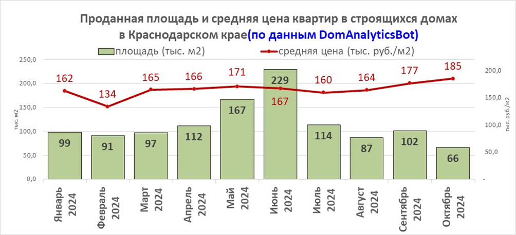 В Краснодарском крае за октябрь продали на 34,8% меньше жилой площади, чем в сентябре, и это на 71,1% ниже пикового значения июня. Средняя цена за октябрь увеличилась на 4,7%. Расчёты выполнены по данным сервиса DomAnalyticsBot, по результатам анализа проектных деклараций 1 251 строящегося дома. Больше аналитики по новостройкам в телеграм-канале DomAnalyticsInfo