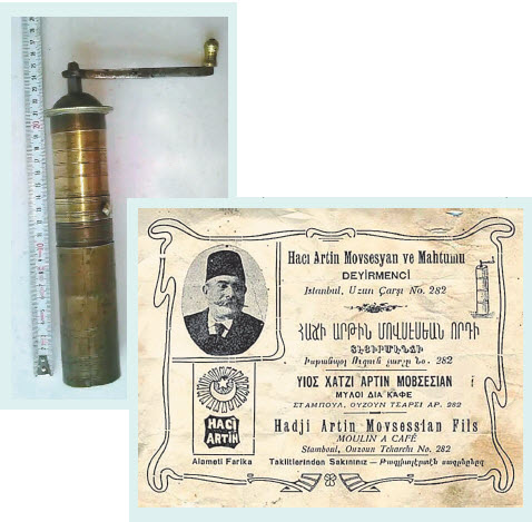 Бронзовая ручная мельница со съемной складной ручкой. Этот предмет не так уж и давно был обычным в любом восточном доме. И даже сегодня, если мы покопаемся в наследстве наших прабабушек, есть вероятность найти такую. Она часто мелькает в восточных фильмах. И часто была предметом, передаваемым по наследству. Эти бронзовые мельницы для ручного помола кофе, были сконструированы армянином Гаджи Артином Мовсесяном. Прозвище Гаджи означает, что Артин Мовсесян (в греческой интерпретации Тасос Моисидис) был армянским паломником на Святой Земле.