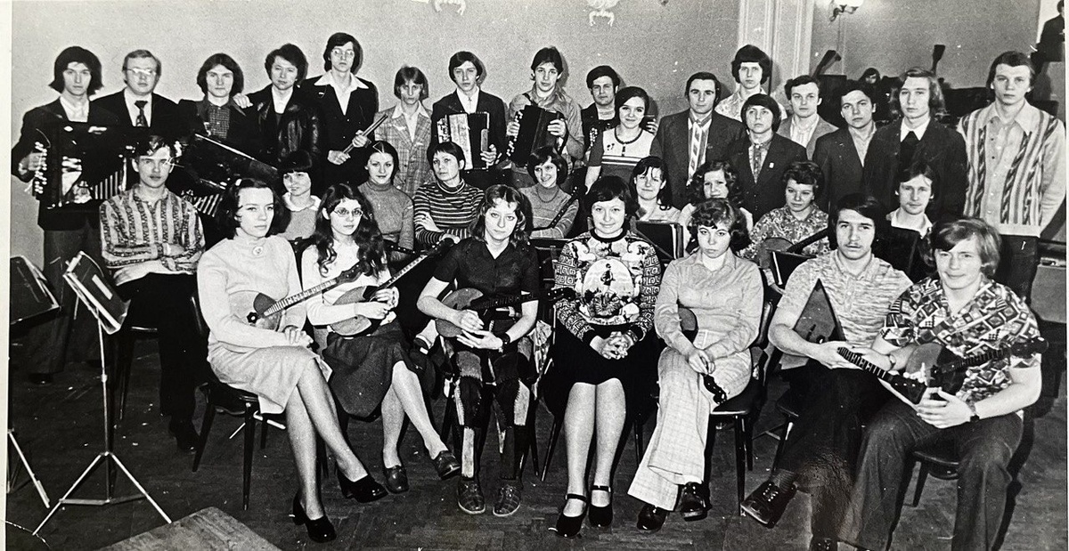 Прикладываю фото нашего оркестра. В центре почему-то вместо Подуровского Виктора Михайловича сидит Бобышева. Она кажется заведовала нашим отделением народных инструментов. Фото, похоже, не полное, не все наши на нём присутствуют, но я там есть.