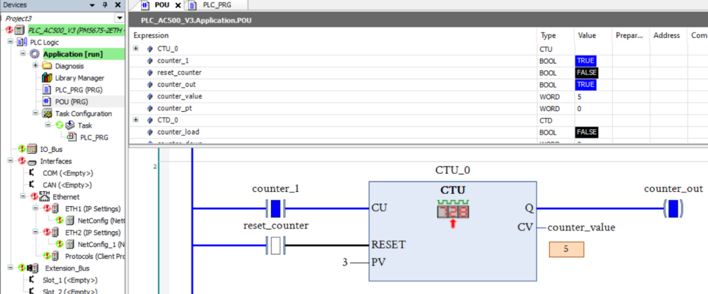 Выше приведен пример счётчика с увеличением в ПЛК. Каждый нарастающий фронт CU увеличивает счётчик на 1. Когда значение счётчика (CV) равно или больше установленного значения, выход счётчика (Q) включается. Счётчик с увеличением сбрасывает текущее значение (CV) до нуля, если вход сброса счётчика включен. Текущее значение счётчика продолжает увеличиваться, даже если выход счётчика равен «истина».