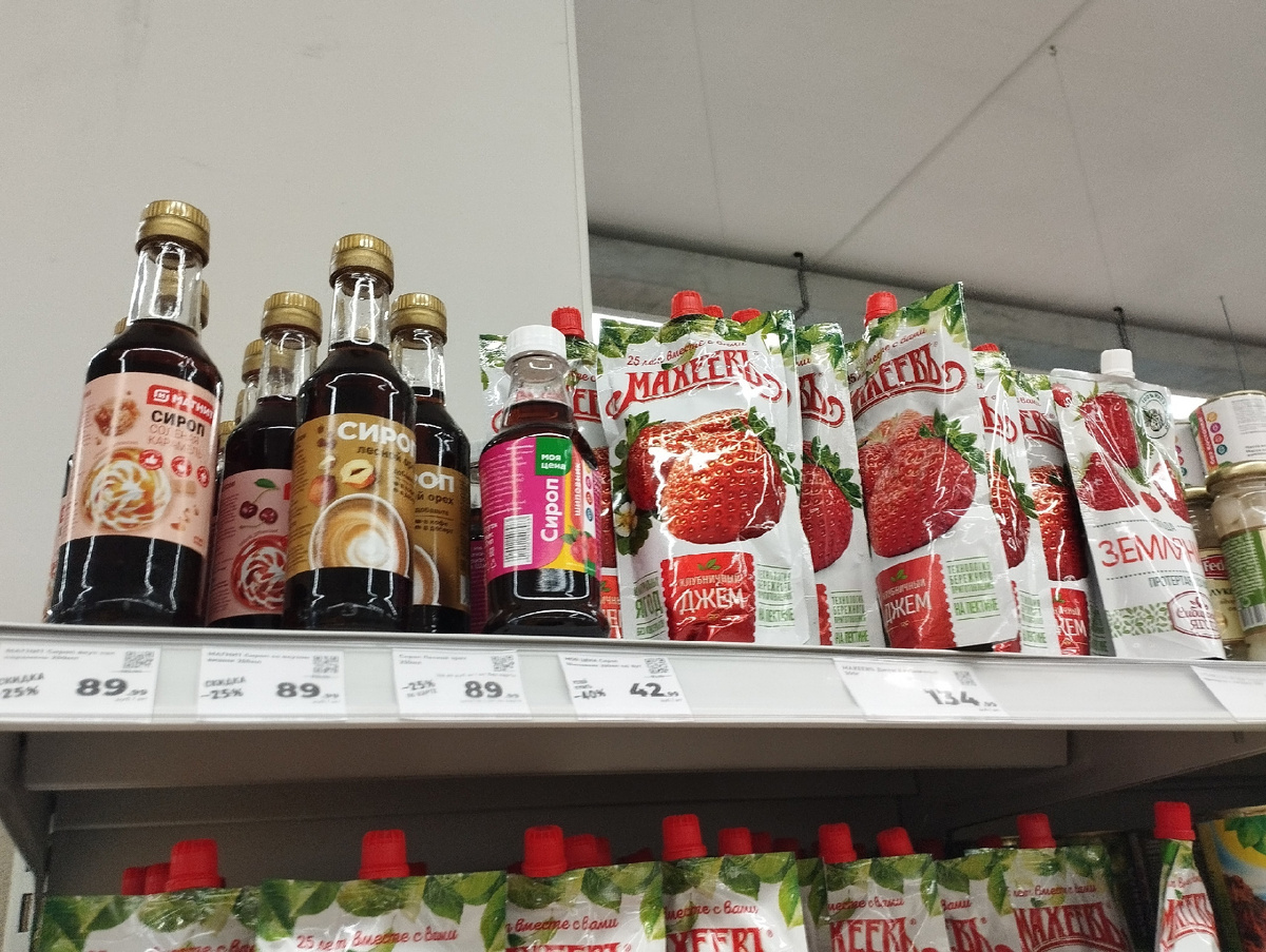 В минуте от "Магнита" и в 5 минутах от моего дома у нас открыли кафе быстрого питания, где я постоянно покупаю кофе. Только у них нет сиропа, что нравится мне больше всего, поэтому, увидев в "Магните" акцию на них, я решила слегка сэкономить. А что, целая бутылка сиропа стоит всего 89 рублей, хватает ее минимум на 20 стаканчиков кофе, это в разы лучше, чем каждый раз платить по 30-40 рублей за сироп в кафе, тем более что со стаканчиком я потом иду домой работать. Сиропы хорошие, не первый год их покупаю, просто со скидкой цена заметно лучше. Есть ореховый, с соленой карамелью, вишневый.