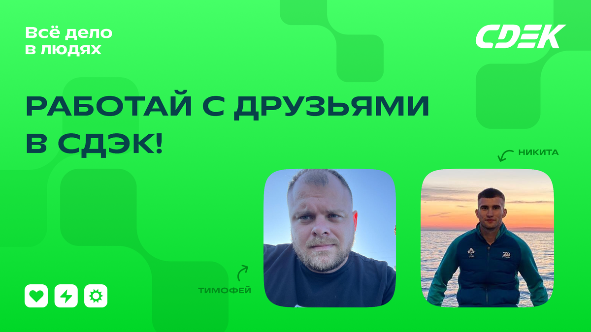 Таланты расцветают среди единомышленников, поэтому мы всегда рады видеть в команде друзей сотрудников — пригласить их можно по реферальной программе. Делимся историями коллег, которые дружат и работают вместе. Команда — ключевое преимущество СДЭК: по результатам внутренних опросов 79% коллег готовы рекомендовать компанию друзьям, а каждый второй сотрудник отмечает теплую и дружелюбную атмосферу в коллективе. Секрет прост — нас объединяют общие цели и ценности. Верим — всё дело в людях, поэтому уделяем особое внимание подбору новичков в команду: нам важно найти таких же неравнодушных и горящих своим делом специалистов. Помогает в этом реферальная программа «Приведи друга». Действующие сотрудники рекомендуют знакомых, друзей, родственников и бывших коллег на открытые вакансии. Так мы привлекаем в компанию близких по духу людей — работать вместе комфортно и легко. В 2024 году уже более 300 друзей по всей стране присоединились к команде СДЭК. Делимся историей Тимофея Красильникова и его