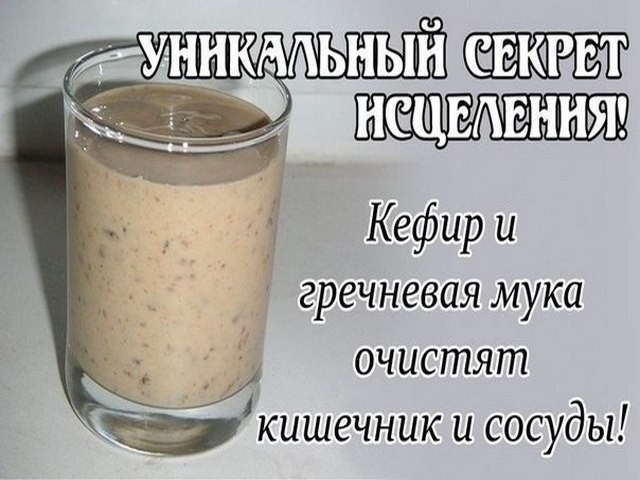 Рецепт целебного средство для очищения сосудов и кишечника: необходимо одно столовую ложку гречневой крупы размять в кофемолке до состояния однородной муки, добавить муку в стакан кефира, поставить в холодильник. Утром, за полчаса до еды выпиваем целебное средство. Курс лечения – 14 суто