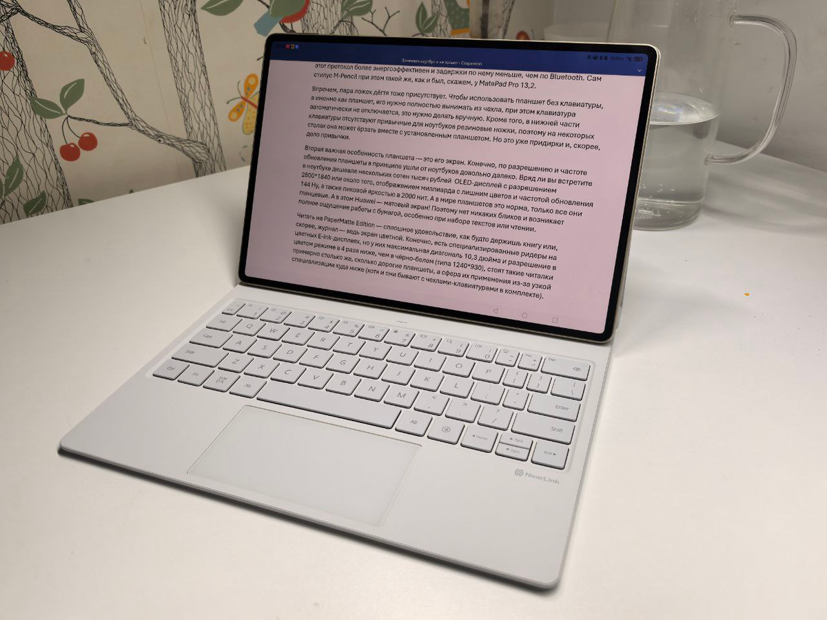 Кроме того, в новой клавиатуре решена ещё одна проблема предыдущих поколений MatePad: прямо внутри неё сделали отсек для хранения стилуса, благодаря чему тот теперь никогда не потеряется. Я вот свой стилус всегда оставлял дома, потому что когда он примагничен сверху – это здорово выглядит на столе, и его очень удобно брать, но в рюкзаке, увы, постоянно отваливается и остаётся где-то в его недрах. Теперь же в «походном» положении стилус надежно сохраняется внутри клавиатуры и никуда не выпадает. И там же заряжается, при этом его можно достать и примагнитить на верхнюю часть корпуса. Кстати, это обязательно нужно сделать, чтобы первый раз активировать клавиатуру и стилус: я довольно долго провозился с ними, пытаясь настроить новый планшет. Подключаются они оба по NearLink, этот протокол более энергоэффективен и задержки по нему меньше, чем по Bluetooth. Сам стилус M-Pencil при этом такой же, как и был, скажем, у MatePad Pro 13,2.