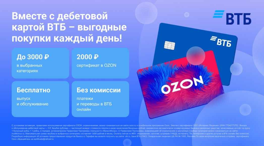 🔥 Бесплатная дебетовая карта ВТБ с выгодами + 2000 ₽ в Ozon!