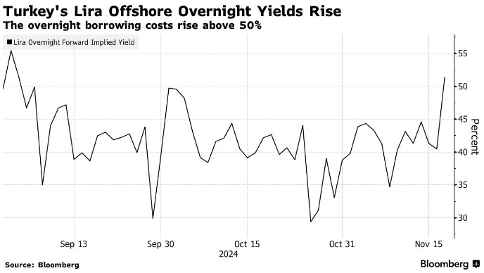 Трейдеры сокращают риски по позициям Carry. Доходность овернайт поднимается выше 50% впервые с сентября. Стоимость заимствования турецких лир overnight на офшорном рынке впервые с начала сентября превысила 50%, так как трейдеры вышли из некоторых своих так называемых «керри» позиций на фоне потерь, понесенных в этой валюте. Форвардная вмененная доходность по сделкам overnight поднялась на 11 процентных пунктов до 51%, самого высокого уровня с 3 сентября, сигнализируя о том, что зарубежные фонды, вероятно, закрыли некоторые длинные позиции по лире. В понедельник турецкая лира обесценилась после того, как государственные кредиторы воздержались от агрессивной защиты обменного курса, по словам людей, знакомых с этим вопросом. Во вторник давление продаж было менее сильным, так как государственные банки поддержали курс валюты, по словам трейдеров, знакомых с операциями, которые попросили не называть их, так как не имели права говорить публично. Офшорная форвардная подразумеваемая доходность
