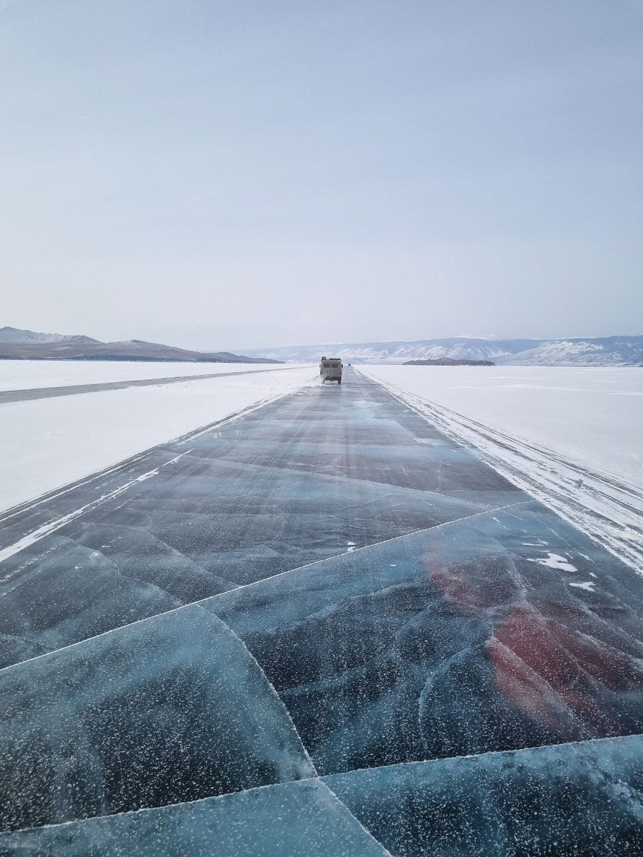 У нас была поездка в конце февраля, лёд был крепок, дорога открыта, поэтому никто не ожидал, что придётся посмотреть на ледяные сквозные разломы своими глазами и понаблюдать каскадерские трюки от бурятских водителей.