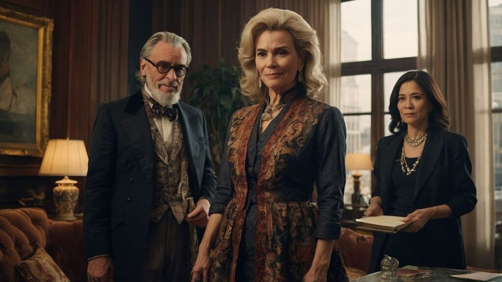 Дама лет 55-60, явно принадлежащая к высшим слоям общества («Королева»). Одета вызывающе дорого, увешана драгоценностями. Сидит на краю стола со строгим, и даже угрюмым выражением лица, настороженно отодвинувшись от всех и почти ни с кем не разговаривает.
