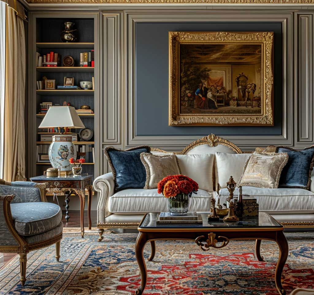 Барокко славится своими сложными формами и орнаментами, которые часто включают растительные мотивы, витиеватые узоры и скульптуры. В этом стиле используются глубокие темные, теплые и насыщенные цвета, такие как бордовый, темно-изумрудный, горчично-бежевый, а также классический контраст черного и белого.