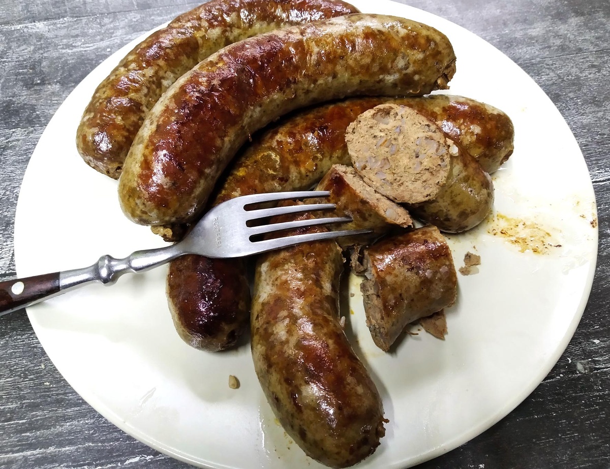 Вкус этой колбасы не идёт ни в какое сравнение с той, что продают в магазине. Эта колбаса пахнет русской печью (хотя, откуда?), утренней росой на траве, стадом коров, идущих на выпас. В общем, детство у бабушки, школьные каникулы. Очень по вкусу похожа эта колбаса на ту, что была в моём далёком детстве. Сделать самому её совсем несложно. Для этого даже не нужны никакие специальные приспособления.