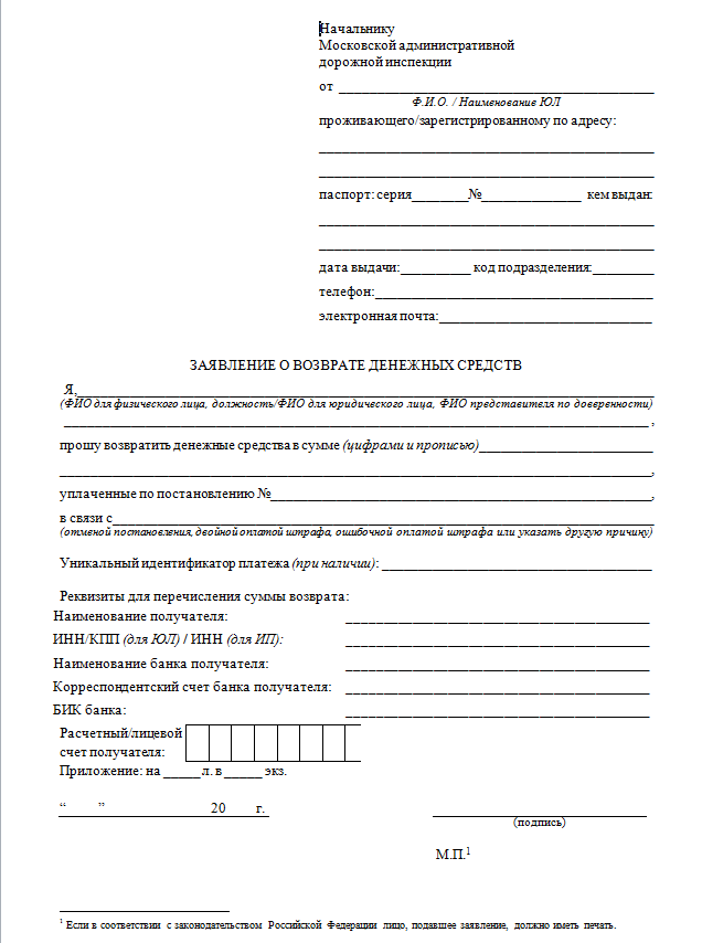 Всем добрый день! В этой статье я хочу рассказать, как вернуть свои кровные денежки если вы ОПЛАТИЛИ штраф, а потом выйграли суд у МАДИ или АМПП. Ну а чтобы вернуть свои кровные, для начало надо выйграть суд. Как выйграть суд у АМПП я рассказываю в предыдушей статье. Там все расписано для чайников! https://dzen.ru/a/Y19ZasaiUwQqJGG3 Заявление подается аналогичным образом. Его можно написать лично в МАДИ, подать через официальный сайт или интернет-портал. Важно отметить, что через госуслуги подать заявление временно нельзя. Сервис не предоставляет услуги по возврату денежных средств. Сроки: подачи заявления, его рассмотрения, возрат средств. Заявление на возврат можно подать в течение трех лет со дня уплаты. Срок рассмотрения заявление в течение 30 дней с момента получения заявления МАДИ Возврат производится в течение одного месяца со дня подачи заявления о возврате. Заявление подаем через MOS.RU https://www.mos.ru/appeals/madi/refund/?ysclid=m3oh3fs48v894768862 Ссылка на образец зая
