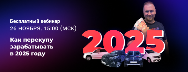 26 ноября в 15:00 по московскому времени состоится бесплатный вебинар «Как перекупам зарабатывать в 2025 году». Мероприятие поможет перекупам и подборщикам понять основные тенденции на рынке подержанных автомобилей и составить эффективный план работы на 2025 год. Основные темы вебинара: 🔎 Перспективы рынка б/у автомобилей в 2025 году