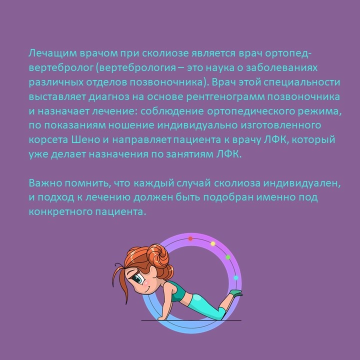 Как прекрасно было бы- выпил таблетку или 2 … или даже 10 и все, позвоночник прямой, как струна.. Но к нашему великому сожалению, от сколиоза не существует никаких чудодейственных лекарств. Глядя на рентген искривленного позвоночника, родители хотят лишь одного – избавится от сколиоза. Но такое возможно в редких случаях, а уменьшение градусов может быть не единственной задачей лечения. Лечение сколиоза должно быть комплексным. Может длится годами. Ортопедическое лечение (ношение корсета Шено), до окончания костного роста пациента, а это происходит в 17-19 лет. Гимнастику нужно будет выполнять и дальше. Лечащим врачом при сколиозе является врач ортопед-вертебролог (вертебрология – это наука о заболеваниях различных отделов позвоночника). Врач этой специальности выставляет диагноз на основе рентгенограмм позвоночника и назначает лечение: соблюдение ортопедического режима, по показаниям ношение индивидуально изготовленного корсета Шено и направляет пациента к врачу ЛФК, который уже делает