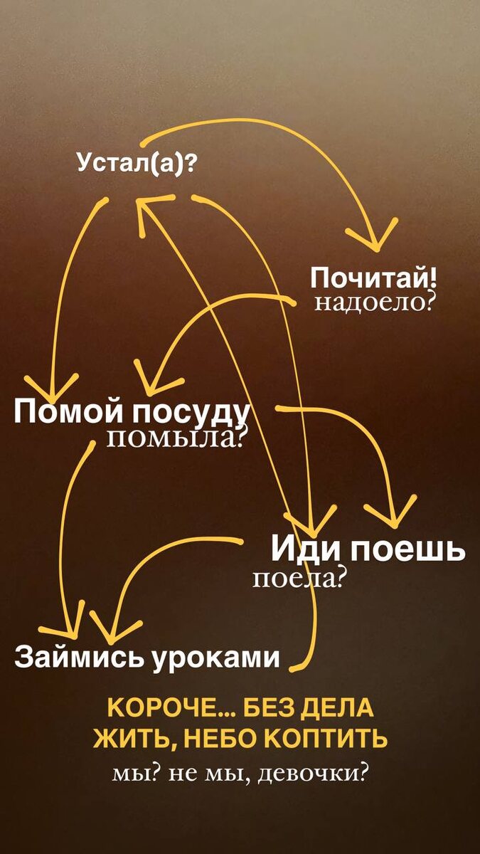 Пришел комментарий в ответ на мой пост про школу. Я в своей области часто сталкиваюсь с тем, что когда предоставляется человеческая среда, родители вдруг начинают тревожиться, что мало нагрузки, что ребёнку легко и сами требуют усилить задания, требования и нагрузку....а дело не в нагрузке и темпе, дело в нормальных взаимодействиях, поэтому дети и говорят , что легко учится. Это грустно. Вообще, такой подход к себе, а теперь и к своим детям — не удивителен. Нас научили, что жизненная цель — как можно сильнее задолбаться (ТОГДА ТЫ МОЛОДЕЦ!!!) «Спишь? На том свете отоспимся!» «Лучший отдых — это смена деятельности» «Безделье - не отдых» «Что сидишь без дела? Иди лучше … (подставляйте свое)» Если тебе легко и комфортно, спокойно и ты еще и рад(а) — ну ни хрена ж себе!!! Сейчас мы тебе придумаем занятие! И придумывали, смотрим иллюстрацию и я продолжаю. Меня, без преувеличений, года три потряхивало, после перехода на онлайн и собственный график работы, который принципиально отличается от