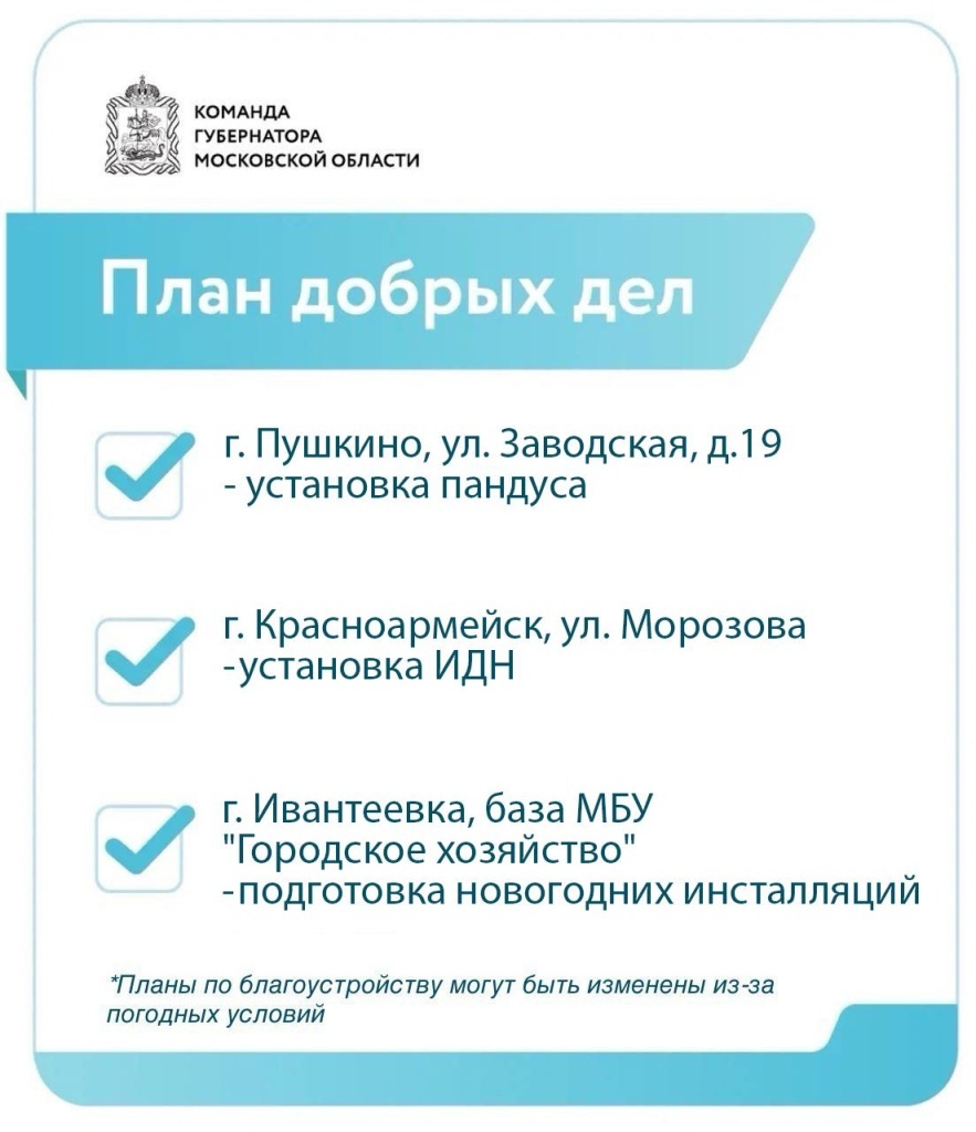 Добавим, что также в Городском округе продолжаются работы по благоустройству. Так, например, в Пушкино планируют установить пандус по адресу ул. Заводская, д.19. В Красноармейске на улице Морозова будет создана искусственная неровность для повышения уровня безопасности.