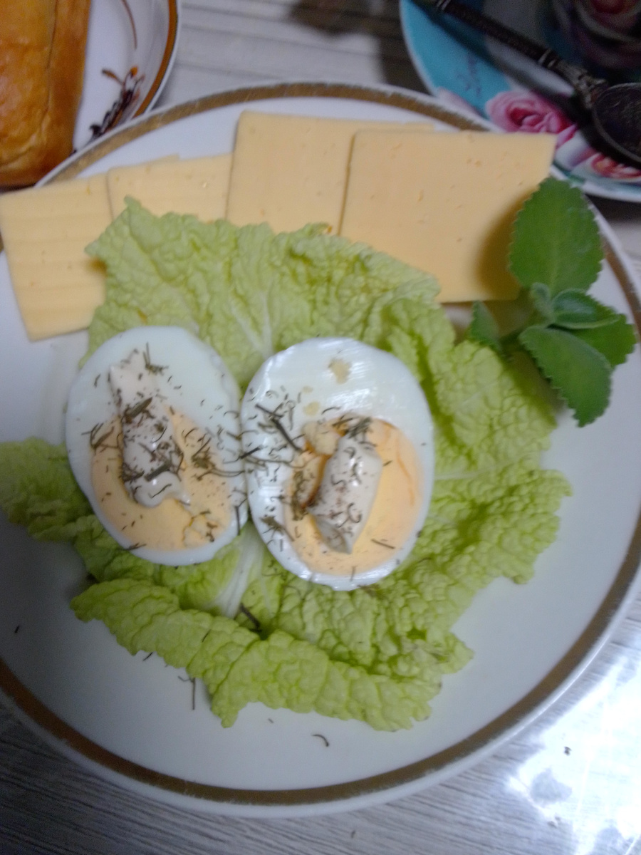 Завтрак у меня сегодня очень простой: вареное яйцо под майонезом, которое я немного присыпала сушеным укропом, на овощной подушке из пекинской капусты. Это и вкусно, и полезно.