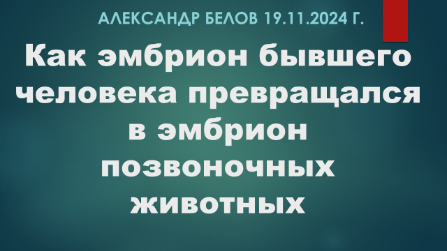 u С позиции теории инволюции, все обстоит с точностью до наоборот. Эмбриональные закладки организма человека, в связи с утратой разума, могут изменятся, причем, изменяется в большей степени завершающая стадия эмбрионального развития. Это связано с тем, что без разума и речи человек может жить и размножаться, и как показывает развитие животного мира на примере типа хордовых и позвоночных – жить вполне успешно. Не примитивные хордовые животные предки человека, а человек – предок примитивных хордовых, но и не только их, конечно.