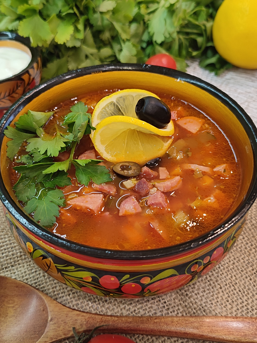 Говорят, солянка – это суп, который придумали наши предки, чтобы показать, как из хаоса рождается вкус. Немного копченого, чуть соленого, щепотка кислого – и вот он, идеальный баланс. Этот суп как жизнь: густой, яркий и щедрый. Идеально подойдет для тех дней, когда хочется согреться не только телом, но и душой.