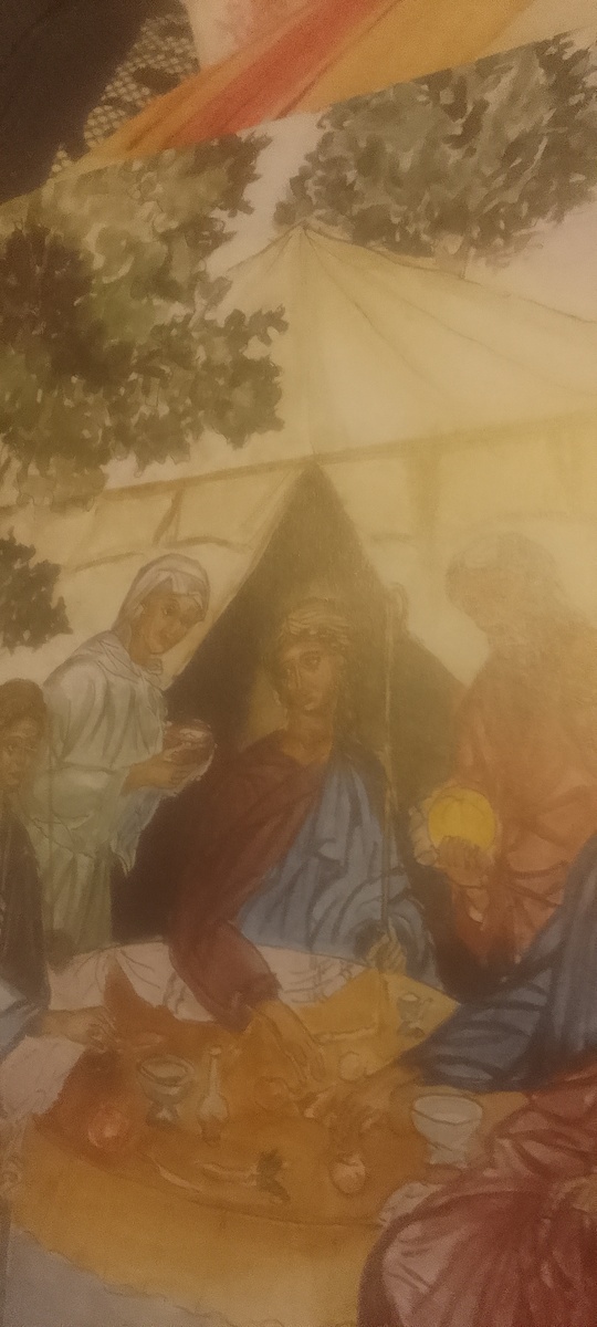 Господь заключил завет с Аврамом и обещал произвести от него множество народов,а в знак завета изменил ему имя - Авраам, и его жену назвал Сарра. Однажды летним днём, когда Авраам сидел у своего шатра он увидел трёх странников. Столетний старец встал побежал им на встречу и пригласил отдохнуть в тени дуба; он велел Сарре заместить хлеб, а сам поспешил к стаду, выбрал телёнка и велел приготовить. Странники ели, а Авраам стоял возле них под деревом. - Где твоя жена Сарра? - спросили они. - Здесь, в шатре. - Я снова буду у тебя Через год - сказал один из них, - и у твоей жены Сарры родится сын. Сарра стояла у входа в шатёр и всё слышала. Ей стало смешно, потому что она и её муж были уже слишком стары, чтобы иметь детей. - Почему она смеётся? - спросил странник, - Разве есть что-нибудь трудное для Господа? В назначенное время я приду к тебе,и у Сарры будет сын.