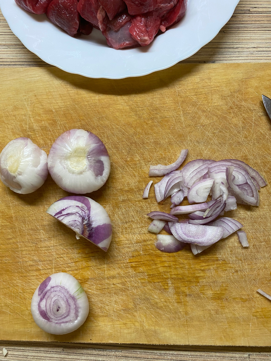 Купила 500 гр говядины в мясном магазине охлажденное, специально для гуляша (там нет прожилок). Сначала подготовить лук - очистить, промыть и нарезать как на фото Нарезанный лук обжарить на сковороде с растительным маслом Пока жарится лук на маленьком огне, нарезаем говядину (предварительно куски промыть водой) я нарезала очень мелко - быстрее готовится и мясо мягкое получается Когда обжарился лук выкладываю прямо к луку нарезанное мясо Все перемешиваем и обжариваем на среднем огне Процесс жарки (будет выделяться жидкость) продолжать жарить Пока жарится мясо очистить морковь, промыть и нарезать как на фото Когда мясо обжарится выложить морковь и вместе пожарить Часто перемешиваем Добавить 1 столовую ложку муки Перемешать И залить кипяченной водой как на фото Перемешать и накрыть крышкой. Оставить тушить на маленьком огне на 40 минут, пару раз перемешать Затем добавить специи - я положила в этот раз соль 1 чайную ложку и молотый чёрный перец и все) другие специи не зах