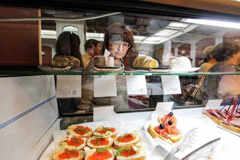 3. Третий по очереди, но не по значению — буфет Михайловского театра. Как и в Мариинке, проблему очередей здесь частично решает бронь с предоплатой заказа: можно не торопясь выпить свой бокал просекко и закусить бутербродом с икрой в антракте, не толкаясь у витрины.