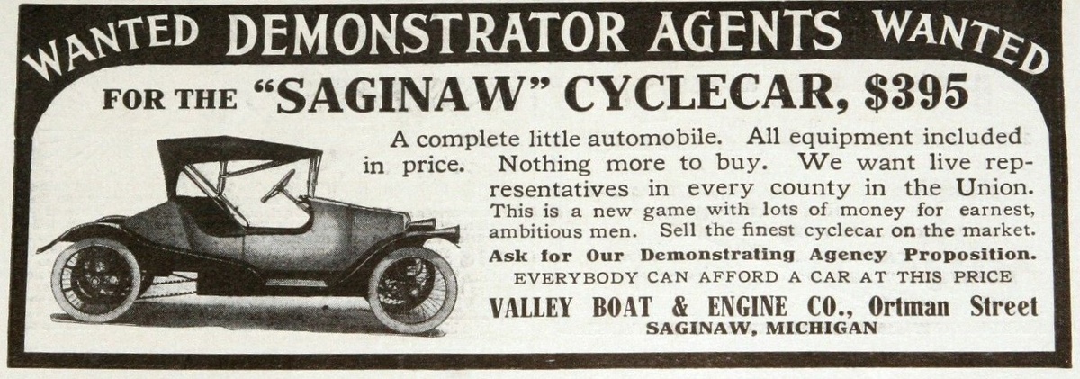 В начале двадцатого века были популярные веломобили. Велосипедный автомобиль это небольшое, легкое, дешевое транспортное средство. Веломобиль обычно вмещал только двух пассажиров. Один из этих автомобилей был: "Saginaw" В рекламе этого автомобиля, были указаны преимущества , как для покупателей, так и для агентов. Для покупателей: Агентам, авторы рекламы предложили поиграть в игру заработать денег. В рекламе, к сожалению не сделан был акцент на фары. Фары были встроенные в передние брызговики, и если посмотреть на картинку, то можно увидеть насколько элегантно выглядят фары.