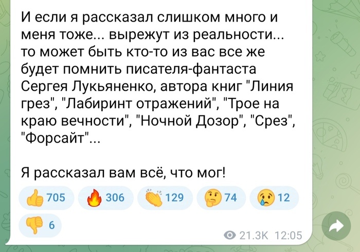 Что хотел сказать Писатель? Без рейтинга, предлагаю думать вместе. Видел я тут, значит, очередной текст уважаемого Сергея Лукьяненко. И заинтересовала меня вот такая вот загогулина: Если с Лабиринтом отражений (глубина, глубина, я не твой) и Ночным Дозором (всем выйти из сумрака) все более или менее понятно, то остальные произведения значительно менее известны. Линия грез, разве что, но не читал. Про «Форсайт» где-то слышал. НО! Книг с названиями «Срез» и «Трое на краю вечности» не существует в природе. Краткий поиск в Гугле - первый раз оба словосочетания вместе с Лукьяненко появляются только в этом посте и его репостах. На странице в Википедии о библиографии Лукьяненко не упоминаются, проверил. Вызов принят, Сергей Васильевич. Сила Пикабу, давайте разгадаем его замысел. Пост автора makaron.official. Читать комментарии на Пикабу.