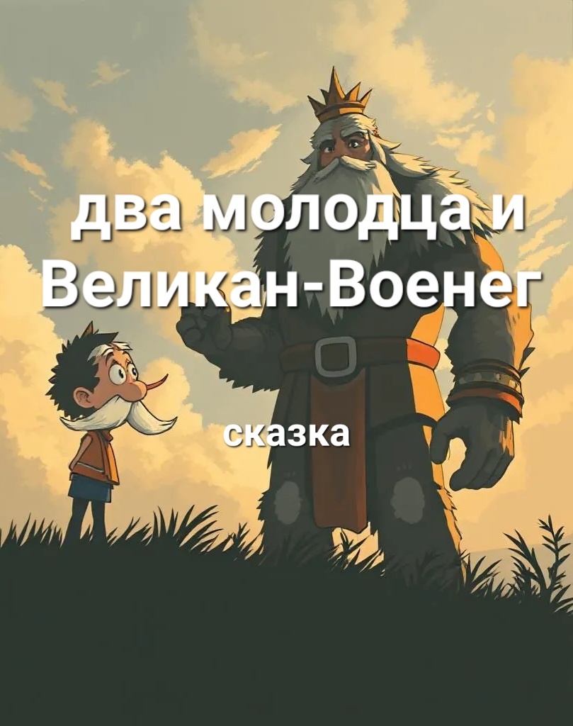 Жили-были в деревне два молодца. Первый умный, другой сильный. Первый так умён, что самых хитрых разбойников вокруг пальца обводил, а второй мог любое чудовище побороть. Однажды поспорили двое, кто из них сможет победить Великана-Военега*, самого свирепого разбойника на Руси. Пошёл умный молодец к Великану-Военегу. Долгой дорогой шёл, дремучими лесами, глубокими морями, высокими горами. Приходит умный молодец к пещере Великана-Военега, да и говорит: - Выходи Великан-Военег на бой! Али испугался? Выходит тогда Великан-Военег и говорит: - Я испугался? Да я тебя мизинцем придавлю! Да я тебя щелчком за сотню верст отброшу, мелкий ты муравьишка! Достает тогда умный молодец копье из-за пазухи, и швыряет его прямо в Великана-Военегу. Вот только силенок не хватило, не добросил умный молодец копье до Великана. Засмеялся Великан-Военег достал свой пудовый топор и чуть не убил умного молодца, еле ноги тот уне