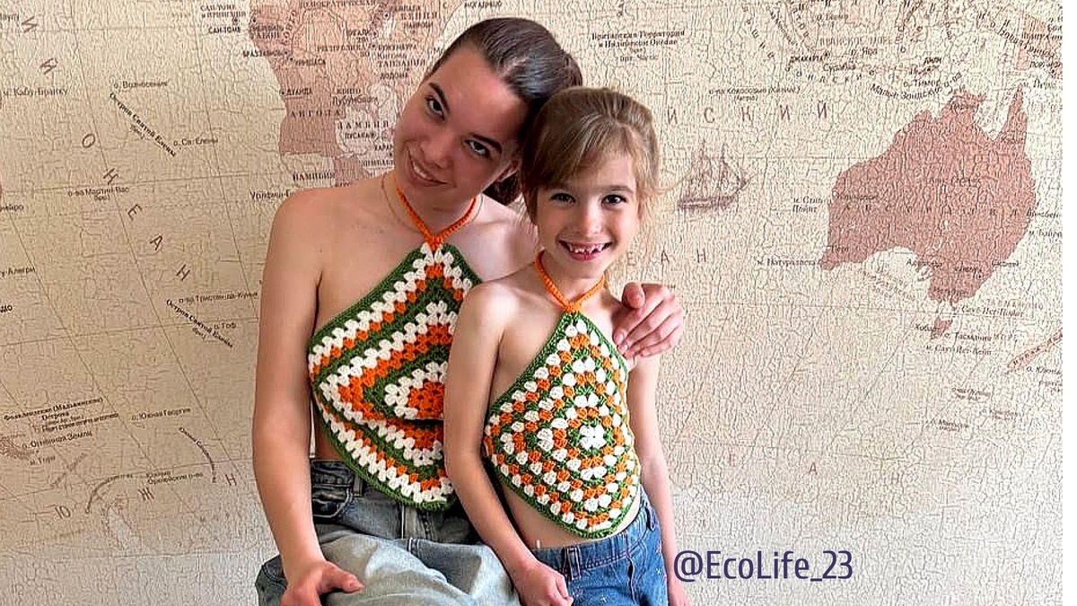 Вязаные летние топики для двух сестричек 6 и 20 лет. Сначала пришла старшая, показала фото квадратного топика из пинтерест: хочу такой! Малая увидела - и конечно же, ей тоже о-очень надо! )))