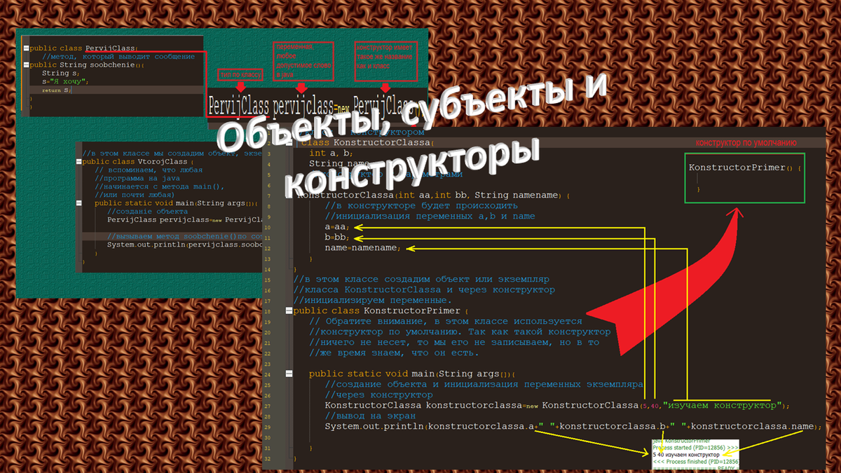 Как мы неоднократно замечали, что с названием языка программирования по java часто встречается аббревиатура ООП, которая расшифровывается как ОБЪЕКТНО-ориентированное программирование. Из этого можно предположить, что в java используются некие таинственные объекты. В научной литературе понятие объекта описывается, как экземпляр класса или его похожая копия, но в другом воплощении. В каком – немного позже. Из этого следует, что каждый объект, который строится по подобию своего класса, должен знать о нем все: его переменные и методы. Если вернуться к нашим домикам, то объект-строитель - это похожая копия класса-дома, по которому он создан, и который знает и помнит все, что находится внутри этого дома. Рассмотрим, как создается объект. Для этого вернемся к предыдущей статье, где мы вызывали метод String soobchenie() из другого класса. Чтобы вызвать метод из другого класса, нужно создать экземпляр этого класса или объект (экземпляр и объект это одно и тоже). PervijClass pervijclass=new Per