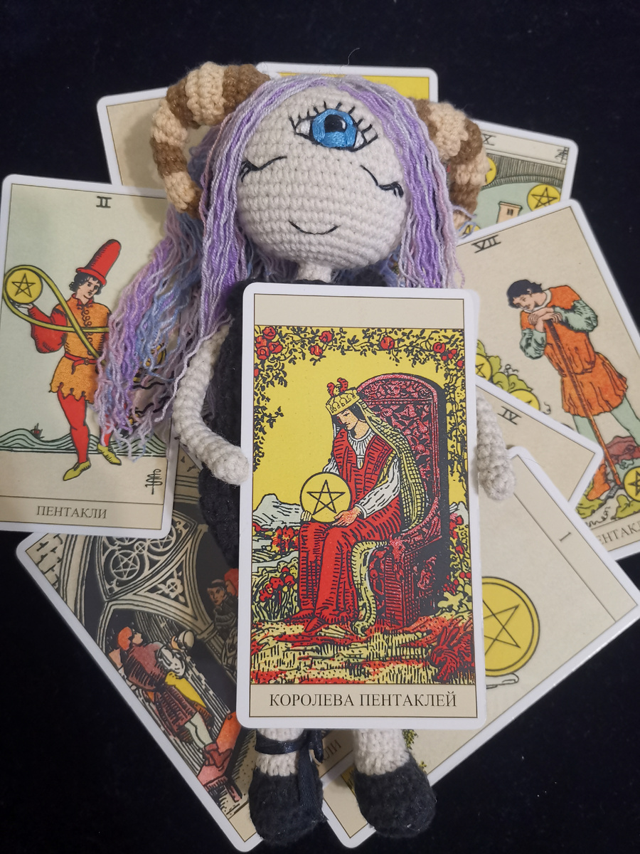 Королева Пентаклей воплощает "Императрицу" с такой же полнотой как Король Мечей "Императора". Две эти карты проявляются в совершенно разных стихиях, но обе одинаково самодостаточны. Королева Пентаклей - воплощение любви к природе. Будучи Водой Земли, она представляет страстную любовь ко всему живому. В колоде Уэйта её трон стоит на фоне пейзажа, кругом нет никаких строений, в то время как за спиной Короля Пентаклей высится его дворец. Уэйту нравилась эта Королева. Он описывает её как "воплощение идеи величия души" и" серьёзное приложение ума; она созерцает свой символ и видит в нём многие миры". Согласно эволюционной концепции, Королевы представляют власть над свойствами масти и стихии. В Пентаклях Королева - владычица природы, не в плане контроля, а в силу глубокой и страстной любви к ней.
