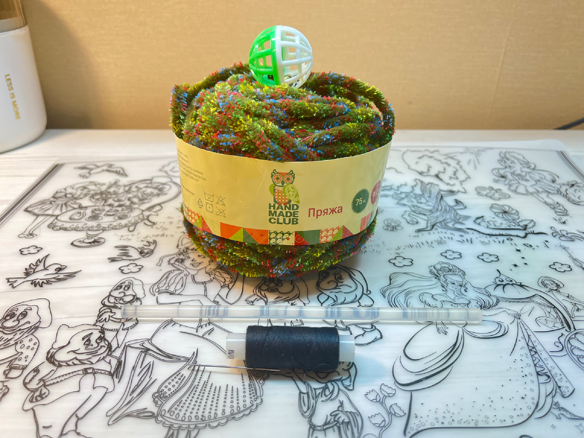 Привет! Ну вот, как я и обещала, сегодня будем использовать пряжу, из которой мы делали елочку. Поэтому я предлагаю сделать для наших котят, кошек и котиков забавную игрушку мышку-погремушку, так сказать для разнообразия. Нам понадобится плюшевая пряжа, нитки с иголкой и шарик с колокольчиком внутри, мне кажется эти шарики есть у всех, у кого в доме живет кошка, стоят они совсем не дорого и обычно продаются по несколько штук в упаковке. Формируем на кончике нитки узелок, капаем капельку клея и затягиваем, чтоб нитка не осыпалась. Протягиваем этот кончик пряжи в одно из отверстий и завязываем узел, для удобства я взяла нитку с иголкой и протянула кончик в соседнюю ячейку. Кончик оставляем примерно 23-25 см. Затем начинаем тщательно промазывать ребра шарика и приклеивать пряжу. Делаем три витка в одну сторону. Затем делаем витки между ними, меняя направление. И так заполняем все пустоты. После первого слоя намотки, мой шарик был формой похож на грецкий орех, немного вытянутый. Втор