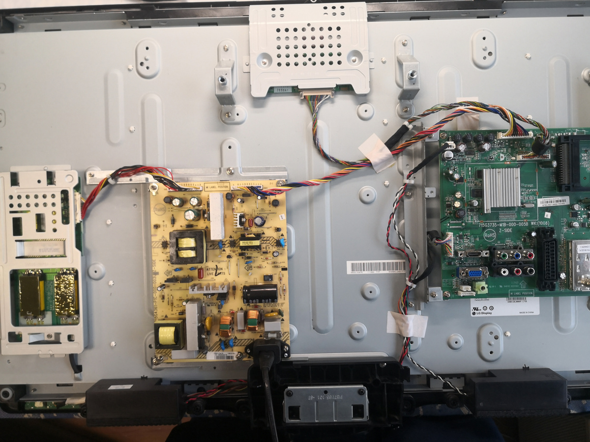 Всем здравствуйте! Сегодня у нас на ремонте телевизор Philips 32pfl3406h/60 с диагнозом не включается. По факту при включении вилки в сеть загорается красный светодиод дежурки. При нажатии на кнопку "power" светодиод гаснет, но ни изображения ни подсветки нет. Давайте вскроем посмотрим. В телевизоре даже чистенько. Блок питания 715g-4361-p1c-000-003 Майн 715g3735-m1b-000-005b Инвертор подсветки lc320wxn 6632l-0624a Дёрнуло меня померить напряжения на блоке питания.