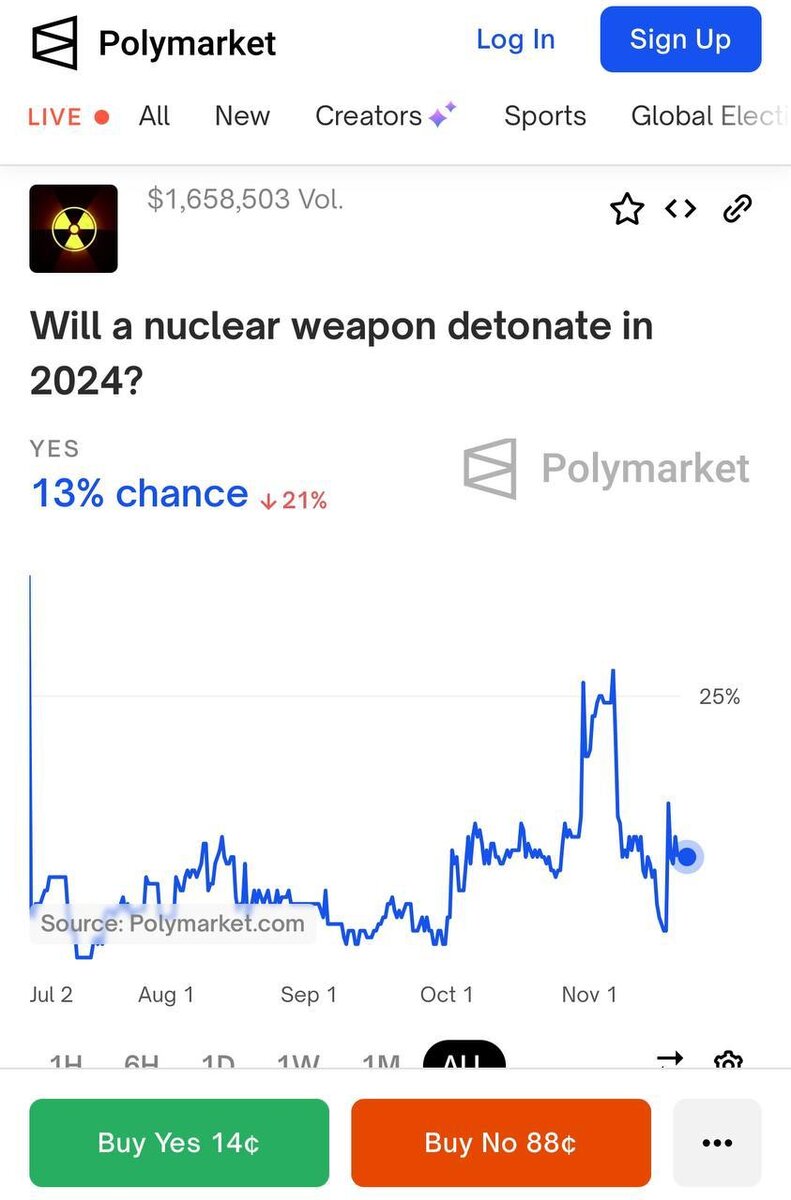 Ставки на ядерный апокалипсис снова актуальны: на платформе Polymarket открылся слот на исход события. Условие — детонация ядерного оружия в 2024 году. Сейчас вероятность этого оценивают в 13%.