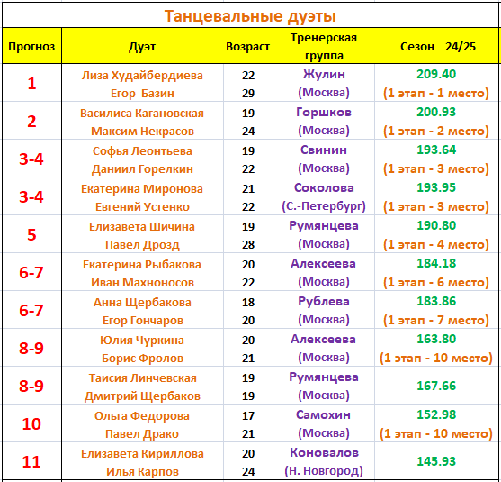 Сдвинулись в этом сезоне с "мертвой точки" оценки петербуржцев Екатерины Мироновой/Евгения Устенко, причем настолько, что Катя с Женей пронеслись мимо Софьи Леонтьевой/Даниила Горелкина, оказавшись впереди по набранным баллам. В Санкт-Петербурге их ждет очная встреча друг с другом и борьба за 3 место. Ожидаю теперь рост баллов от Софьи с Даниилом, которые не так ярко начинают новый сезон, как предыдущий. Только 4 танцевальных дуэта в этом сезоне набирали больше 200 баллов и одним из них стали Василиса Кагановская/Максим Некрасов. Мнения болельщиков относительно этой новой пары разделились, но одобрение от Федерации и судей так или иначе получено, теперь нужно соответствовать ожиданиям и выступать без ошибок.