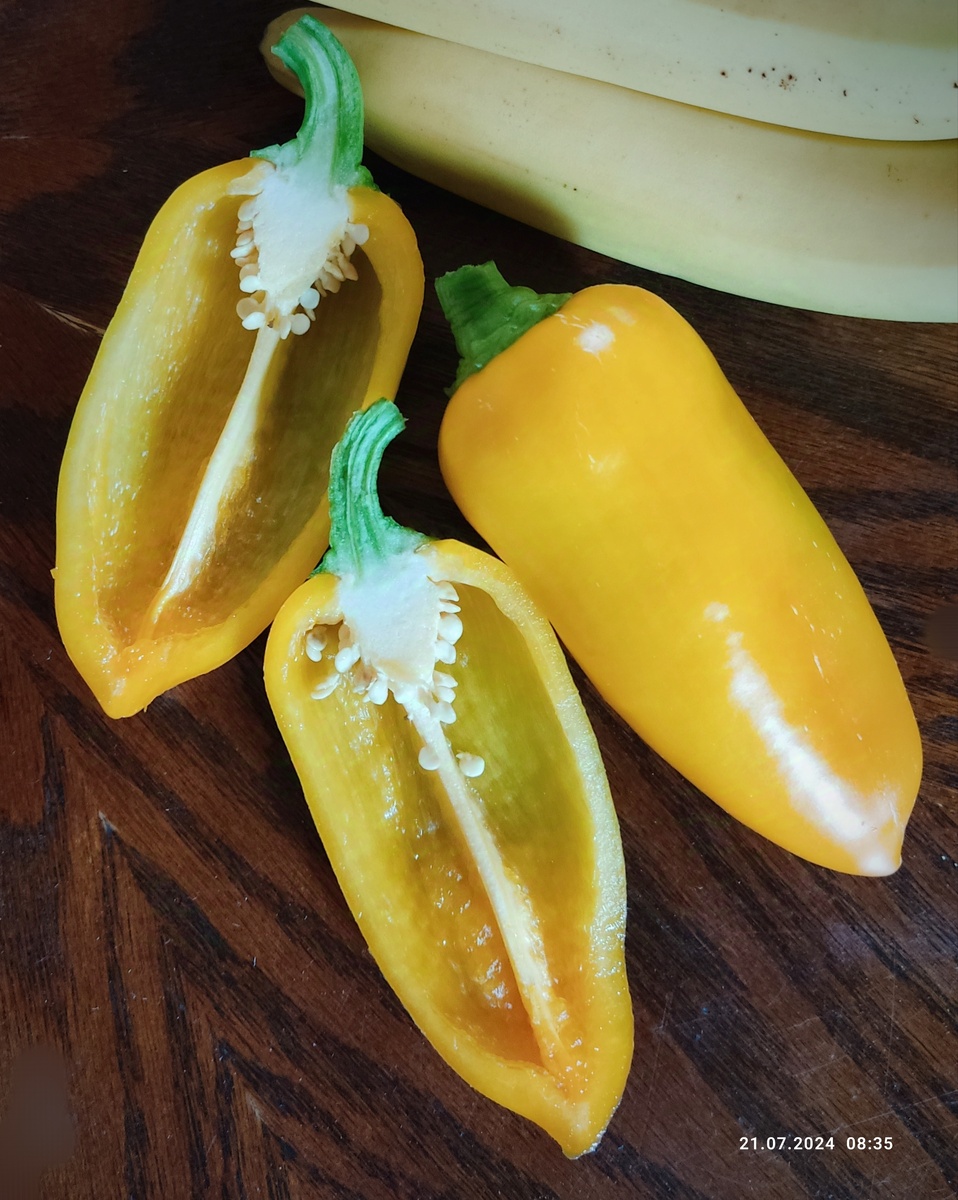И снова название, как говорится, «не в бровь, а в глаз»! Этот перец явный фаворит как минимум среди жёлтых перчиков. Вкусный, сладкий, сочный, хрустящий, но при этом с тонкой шкуркой. Стенка средняя, но это только в плюс - делает перчик абсолютно универсальным для всего! Салаты, заготовки, супы и вторые блюда и конечно же фаршированный перчик. А самое главное - ранний! У меня он созрел вторым из всех посаженных сортов. Урожайный, но созревает волнами. Как раз пока мы ели первый урожай с этого перца, подтянулись и остальные. Красавчик, да? А знаете почему он на фото с бананами лежит? Это история - анекдот на века 😄 Семена абрикосовой фаворитки мне прислала Аня, а рядом с этим кустиком рос другой подаренный перец, от другой дзен-подруги - сорт «Банановый десерт» тоже очень вкусный и был очень похож на абрикосовую фаворитку. В конце лета (вот почему только в конце???) решила посмотреть в интернете информацию про банановый десерт и очень удивилась, почему мой перец вообще не похож на
