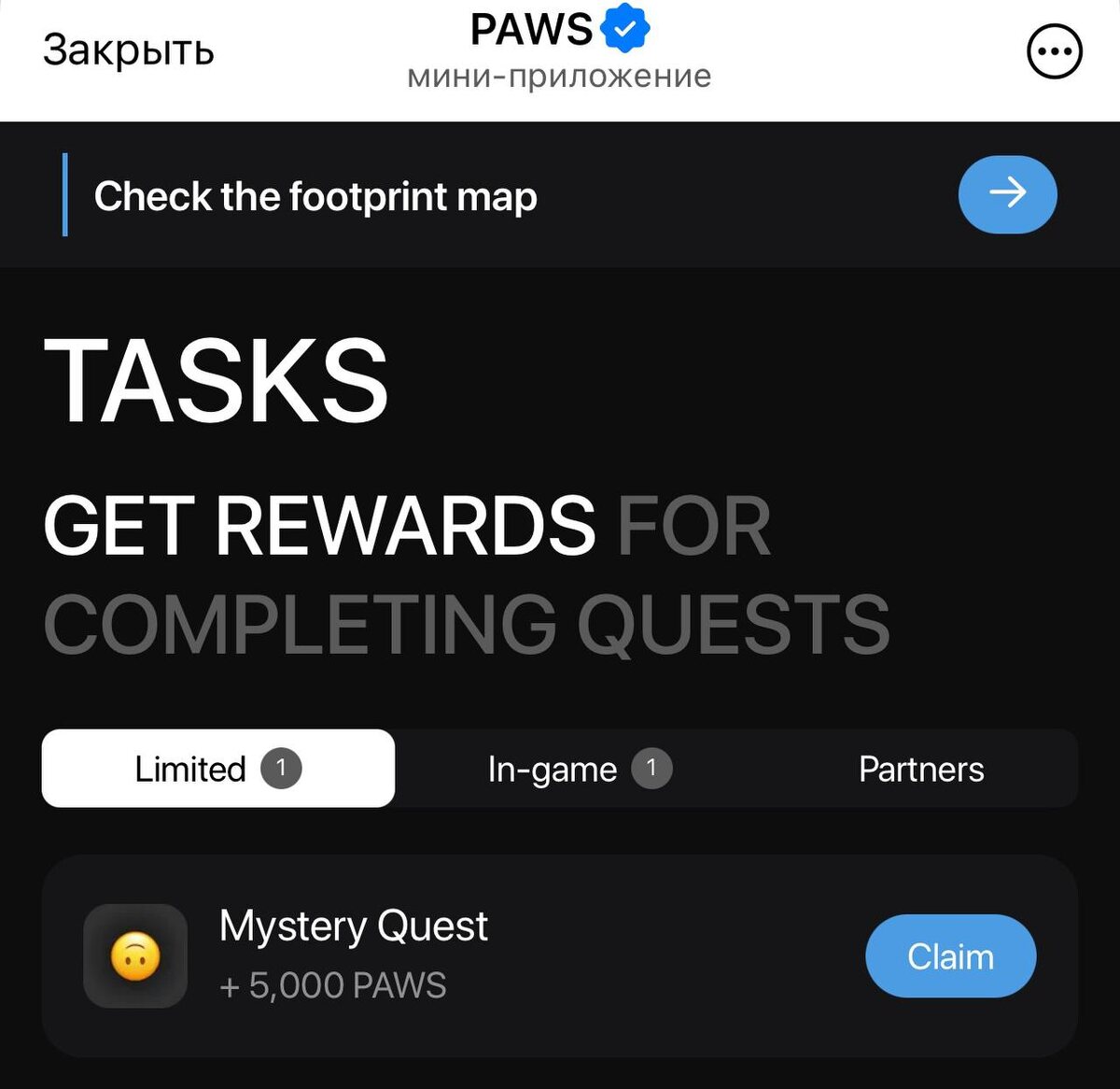 💎 PAWS новое задание Mystery Quest Забираем +5000 PAWS🐾 Как выполнить? У вас должен быть обновлен Телеграм. Заходим в PAWS, на главной странице поворачиваем телефон набок и экраном вниз. Квест будет выполнен! 🐾Присоединяйтесь к PAWS прямо сейчас! Заходим в раздел Earn забираем награду! Топ самых перспективных тапалок: 1. Blum - майнер + мини игра 2. Bcoin - игра 2048 3. PAWS - запустили 1 раз и ждём раздачу.