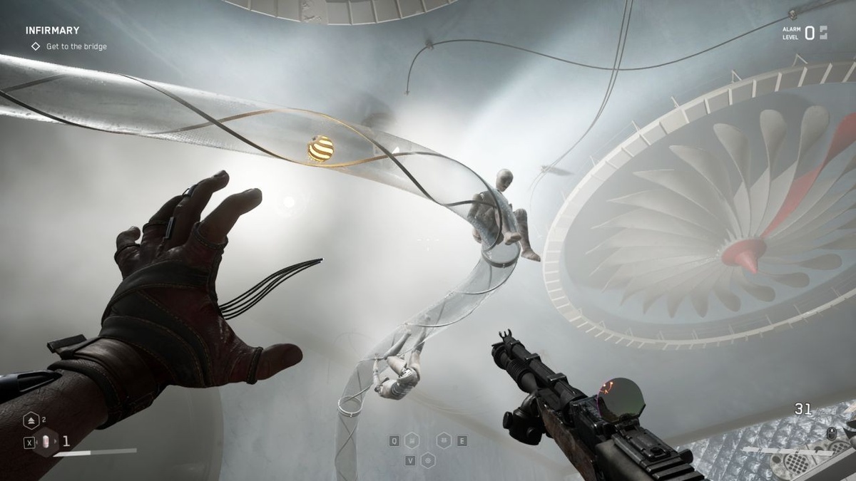 Окружающий мир «Atomic Heart» насыщен интерактивными элементами. Вы можете использовать камеры видеонаблюдения для разведки территории, искать альтернативные пути через вентиляционные шахты или задействовать элементы ландшафта, чтобы создавать ловушки для врагов. Например: