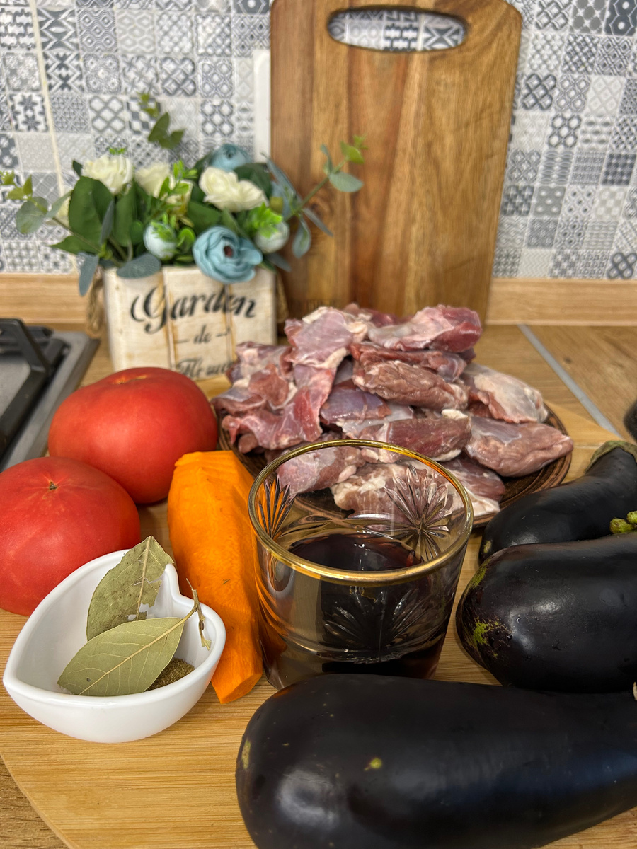 Вам понадобится: говядина - 1,5 кг помидоры - 500 гр морковь - 1 шт баклажаны - 1,2 кг красное вино - 100 мл соль, перец, лавровый лист Добавьте 200 мл воды и тушите на медленном огне 1,5 часа, до мягкости мяса.