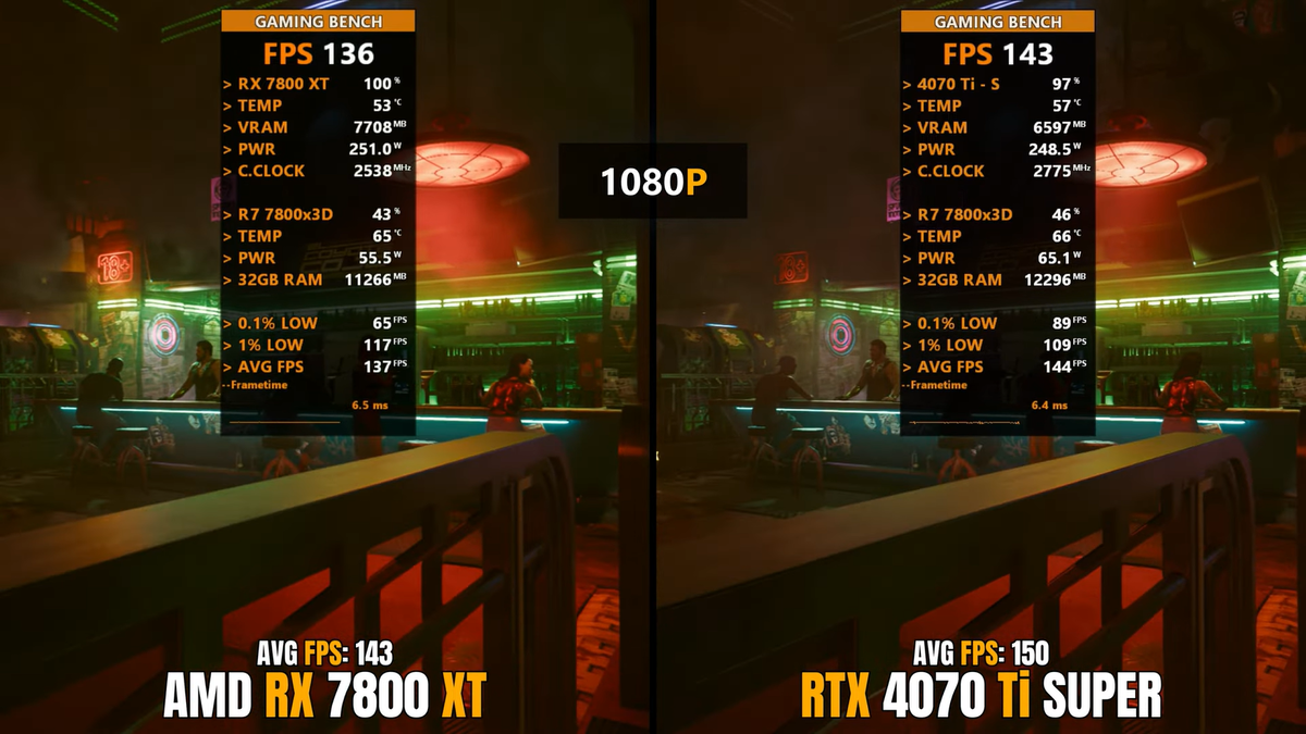 В одном из выпусков на YouTube-канале GAMING BENCH — RGB узнали, какую производительность в играх обеспечивают RX 7800 XT и RTX 4070 Ti Super. A Plague Tale Requiem запускалась с ультра-графикой. В 1080p в этой игре удалось получить в среднем 89 к/с (RX 7800 XT) и 112 к/с (RTX 4070 Ti Super), в 1440p — 67 и 83 к/с соответственно, в 4К — 41 и 47 к/с соответственно. Starfield тестировалась с графикой Custom. В разрешении Full HD средний FPS здесь равнялся 83 к/с и 97 к/с (с 7800 ХТ и 4070 Ti Super соответственно), в 2К — 68 и 78 к/с соответственно, в 4К — 43 и 50 к/с соответственно. Hogwarts Legacy шла с ультра-пресетом. В 2К в этой игре средняя производительность составляла 101 к/с (7800 ХТ) и 99 к/с (4070 Ti S), в 4К — 52 и 55 к/с соответственно, в 2К с RT, FSR/DLSS — 61 и 65 к/с соответственно. В игре Alan Wake 2 с низким пресетом средняя частота кадров равнялась в 1080p — 100 к/с (7800 XT) и 105 к/с (4070 Ti S), в 1440р — 67 и 77 к/с соответственно, в 4К — 37 и 44 к/с соответственно.
