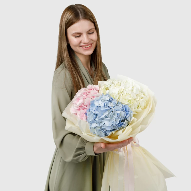 Гортензия — это обворожительный ажурный цветок, который завоевал сердца флористов и любителей цветов по всему миру. Пышные соцветия гортензии сегодня можно встретить не только в садах, но и в букетах. Они придают композиции шарма и изысканности. Монобукет с гортензиями. В этой статье мы рассмотрим, откуда к нам пришла гортензия, сорта, используемые во флористике, а также расскажем, кому дарят букеты с гортензиями. В конце статьи мы собрали советы профессиональных флористов по уходу за срезанными цветами, чтобы они радовали глаз как можно дольше. Гортензия (Hydrangea) — род растений из семейства гортензиевых, насчитывающий более 70 видов. Ареал произрастания этих растений охватывает Восточную и Северную Азию, Америку и некоторые регионы Европы. В дикой природе гортензии встречаются в тропических и субтропических районах, где они предпочитают влажные и тенистые места. Букет с гортензией и кустовой розой. Название «гортензия« происходит от латинского имени «Hydrangea», что в переводе оз