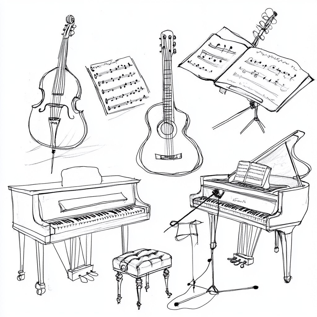 Создано на основе запроса: sketches on a white background as if drawn with a pencil sketch. images related to singing and music. sheet music, piano, sheet music, microphone, guitar, etc. stylish sketches on a white background --- Автоперевод: Эскизы на белом фоне, как будто нарисовано с помощью карандашного эскиза. Как тебе этот вариант? 🤔 https://dzen.ru/id/65c0c65c86e4f837c27b24d7 #ИИ #AI #нейросеть #midjourney #art