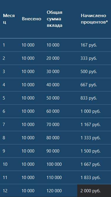 - Каждый месяц вы кладёте 10 000 рублей на вклад.