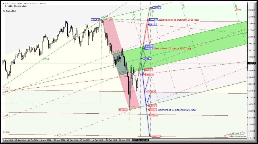 https://basechop.ru/wordpress/?p=40366 Операционный масштаб Minor (таймфрейм Daily) Основные технические уровни для торговли #NDX – Daily – обзор вариантов движения c 29 апреля 2025 года. Предыдущий обзор #NDX (таймфрейм h4) от 15.04.2025 г. 18:49 ____________________ #NDX – NASDAQ-100 В индекс включаются 100 крупнейших по капитализации компаний, акции которых торгуются на бирже NASDAQ. В индекс не включаются компании финансового сектора. ____________________ Движение NASDAQ-100 с 29 апреля 2025 года будет зависеть от отработки и направления пробоя границ зоны равновесия (18950.0 – 19685.0 – 20500.0) вил младшего операционного масштаба Minute-h4. Восходящее движение: При обновлении maximum 20339.4 от 26 марта 2025 года и пробое уровня сопротивления 20500.0 на верхней границе ISL61.8 зоны равновесия вил младшего операционного масштаба Minute-h4 движение #NDX будет иметь восходящий характер и может иметь продолжение к конечной Shiff Line Minute-h4 (21910.0) и к maximum 22225.0