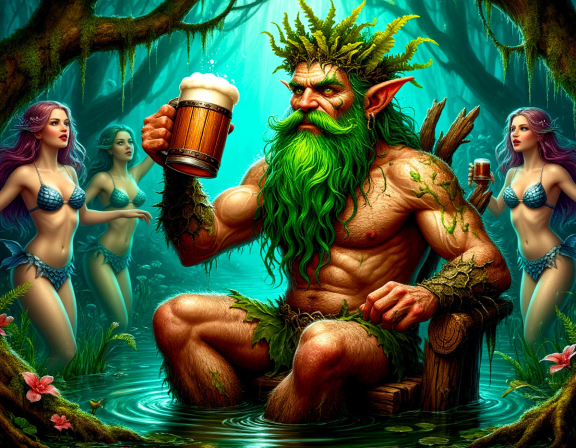 Из воды показались пузыри, а затем вынырнула голова Водяного. Борода у него зеленая, глаза как два изумруда, а на голове тина, словно корона.
